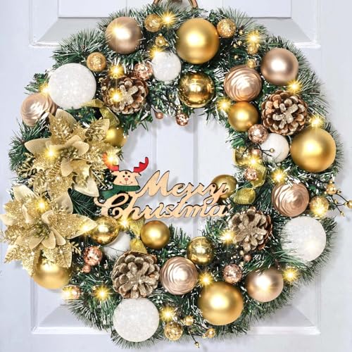 24″ Pre-lit Christmas Wreath with Gold Ornaments, Leaves, Pine Cones