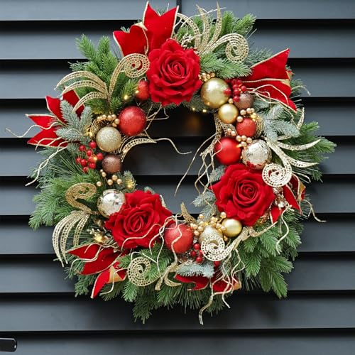 24″ Pre-lit Christmas Wreath with Ornaments, Roses, Ribbon