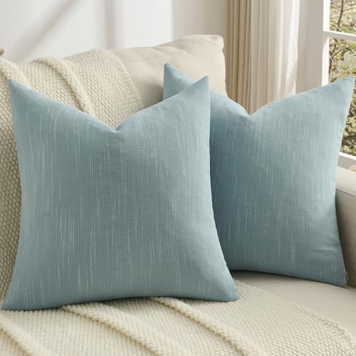 FUTEI Dusty Blue Chenille Decorative Throw Pillow Covers 18×18 Inch Set of 2,Soft Cozy Faux Linen Textured Cushion Case,Farmhouse Home Decor for Couch Living Room