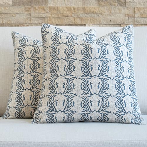 FIOUOVO Floral Throw Pillow Covers 18×18 Set of 2 Block Print Cushion Covers Farmhouse Neutral Accent Decorative Pillow Covers Home Decor for Sofa Couch Living Room Bedroom, Blue